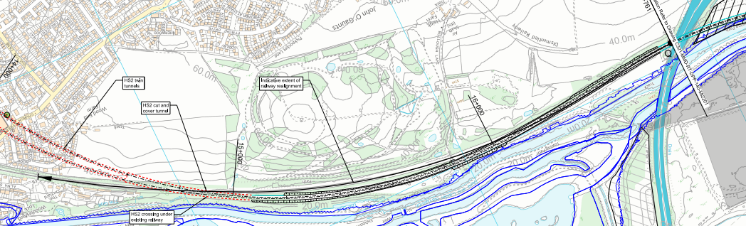 Around two miles of track is indicated for realignment, most likely taking the existing line closer (or into) the County Park, with the HS2 lines in all likelihood passing under the existing line to end up next to the canal.